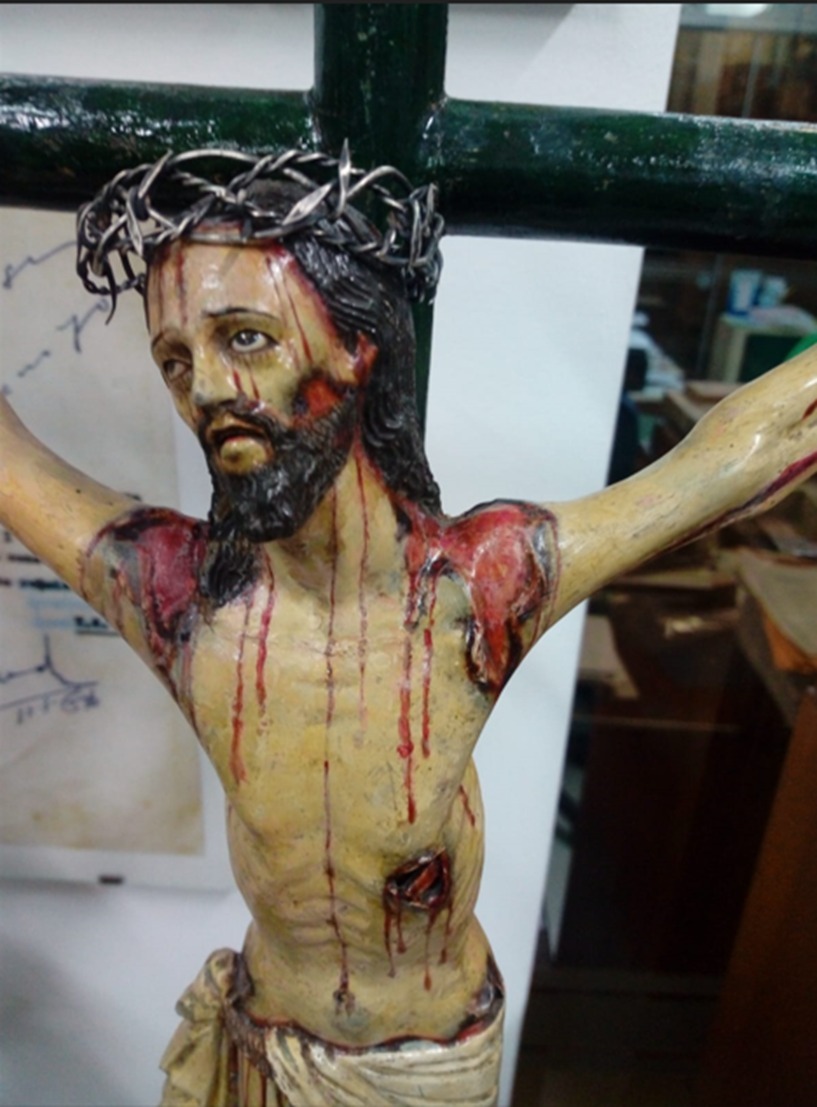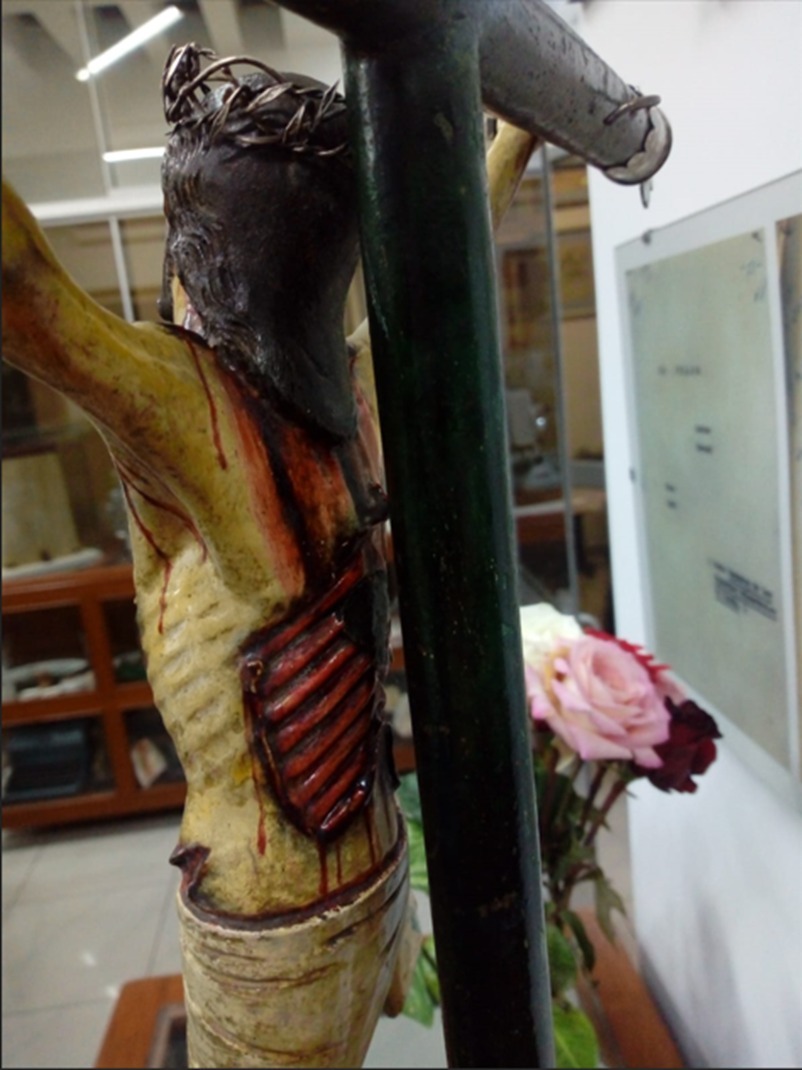 Contaba además que en el altar de la Capilla se exhibía una talla de madera del Cristo Crucificado, de una sola pieza, con el corazón descubierto, el mismo que latía gracias a un fuelle conectado internamente, producto del corte con la lanza que le produjo el centurión Longinos. Recordaba también que ante esa imagen del Crucifijo se arrodilló muchas veces para rezar, y al mismo tiempo pedir por la salud de sus abuelos y padres.