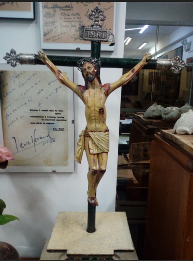 Al pasar los años, y a punto yo de contraer matrimonio, mi padre le pidió a mi hermano César, ya ordenado sacerdote, y por entonces Capellán en Lima en el Colegio Salcantay, que gestionara para que la talla pasara a nuestro poder y presidiera mi boda civil, ceremonia que se realizó en estricto privado en casa, por la salud de mi padre. Mi hermano cumplió a cabalidad el encargo y consiguió que la hermosa talla del Cristo Crucificado de la familia nos acompañe y bendiga nuestro hogar. Una vez culminada la celebración, pasó al estudio del poeta, para su permanente contemplación, como lo hacía de pequeño. Esta hermosa y muy querida reliquia acompañó al poeta hasta sus últimos días.