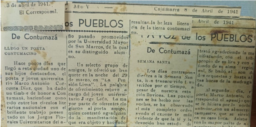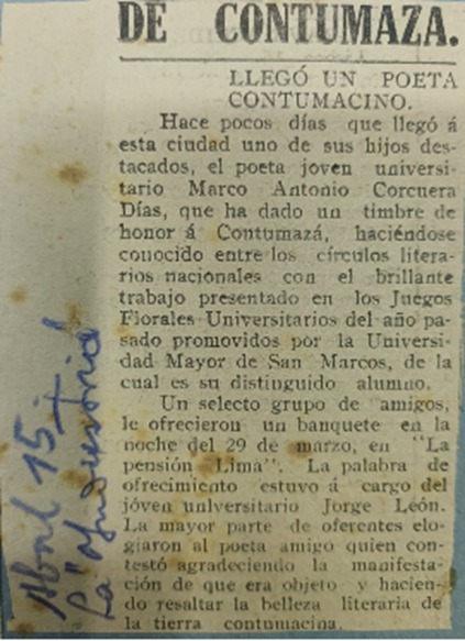 Hace pocos días llegó a esta ciudad uno de sus hijos destacados, el poeta joven universitario Marco Antonio Corcuera Díaz, que ha dado un timbre de honor a Contumazá, haciéndose conocido entre los círculos literarios nacionales con el brillante trabajo presentado en los Juegos Florales universitarios del año pasado [1940] promovidos por la Universidad Mayor de San Marcos, de la cual es su distinguido alumno.